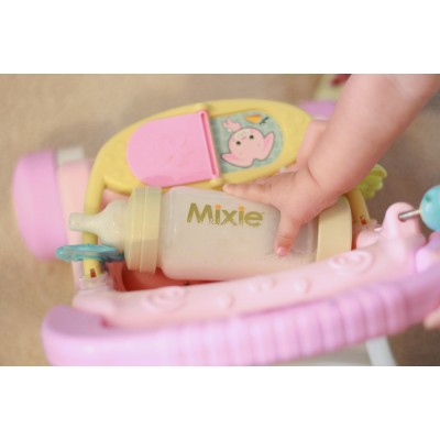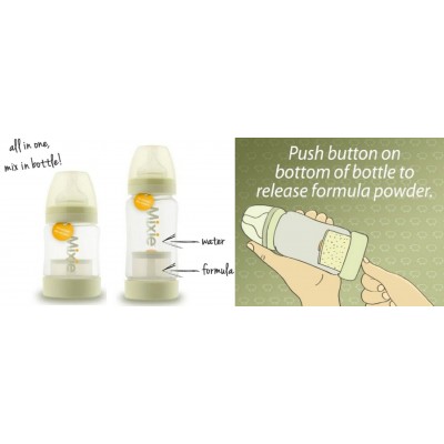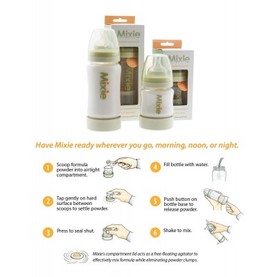 The Mixie Bottle底部有一個專利設計的密封間隔,讓你預先於樽內儲存盒放入配方奶粉,然後蓋好,再從頂部倒入開水,一切便準備妥當。當寶寶肚餓了,只需輕按The Mixie Bottle底部的掣聽到”Pop”一聲,將奶粉混入開水中,再輕輕搖勻奶樽即可。
