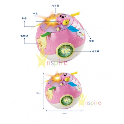 - 當寶寶按鈕時, 轉轉球會讓寶寶學習形狀、數字、動物,並會發出動物的叫聲。而按下不同形狀鍵, 還會讀出形狀名和播放歡樂的音樂,