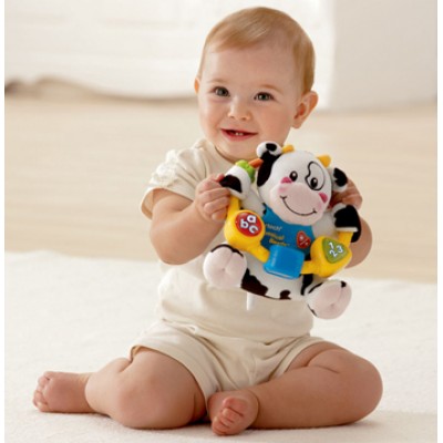 這是最好的方式去學習!這個令人喜愛的軟綿綿牛牛方便小孩子的小手拿起。 它擁有兩個亮燈按鈕和旋轉塊,透過趣味短語和唱歌曲,介紹 ABC,1-2-3和顏色等知識。 有趣的聲音會加入旋律裡頭,激發小孩子的創意。嬰兒按按鈕和滑動的珠子來學習因果的關係;及發展運動技能。