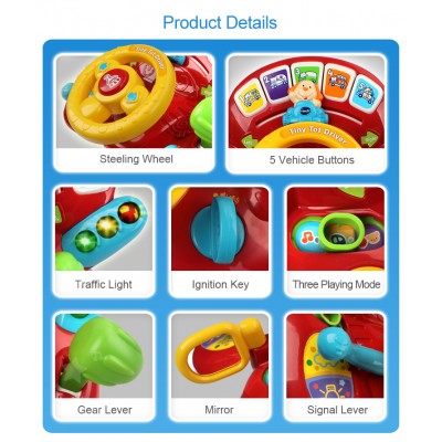嗶嗶!Tiny Tot Driver出發了!這色彩繽紛的玩具,透過有趣的短語和現實的汽車聲音介紹動物,顏色,數字和地點等知識,讓寶寶享受角色扮演的樂趣。寶寶可以轉動方向盤,使微型車子出發到熟悉的目的地,或按下胖胖的按鈕,聽取有趣的短語。 包括亮燈喇叭按鈕,不易碎後視鏡,排檔桿和交通燈。助寶寶發展運動技能,並鼓勵發現和探索。