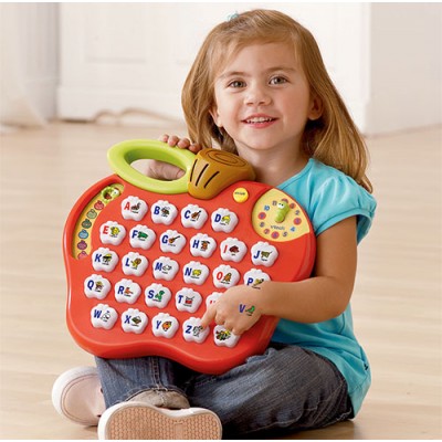 設計造型特別的vtech 英語蘋果, 是學習同接觸英語第一課。板面上有著26個會閃亮的立體小蘋果,時鐘同功能鍵。 轉動時針會按不同時間讀出英語, 互動功能强大! 備有可愛的葉子造型把手,攜帶方便!